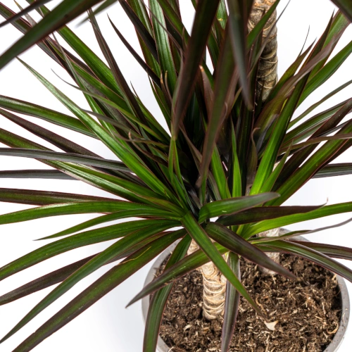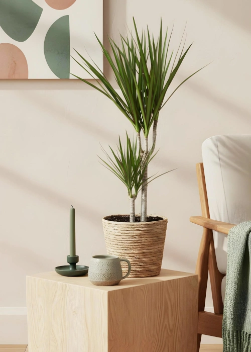 Charakteristisch sind die langen, schmalen Blätter, die aufrecht stehen oder leicht überhängend wachsen. Sie können einfarbig grün sein oder auffällige Streifen und Muster aufweisen. Gerade diese klare Wuchsform macht den Drachenbaum zu einer super beliebten Zimmerpflanze für Wohn- und Arbeitsräume.